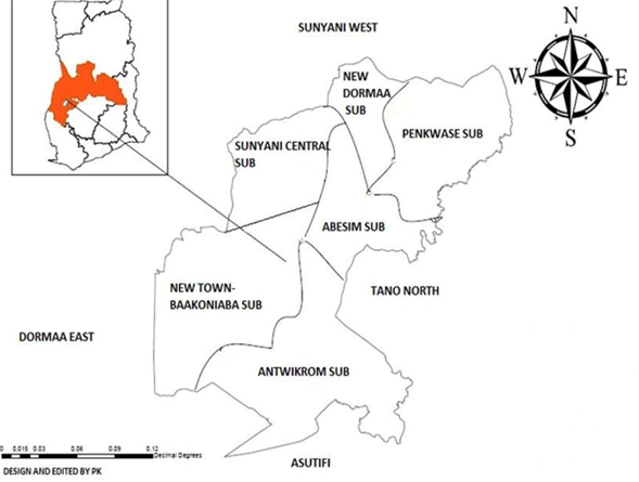 A qualitative study using a semi-structured interview guide was conducted to collect data through face-to-face interviews. The study was conducted in the Sunyani Municipality. The Sunyani Municipality is one of the oldest districts created and one of the twenty-seven administrative districts in the then Brong Ahafo Region of Ghana [13]. It has Sunyani as its municipal capital and is now the Bono Regional Capital. The district lies between Latitudes 70 20’N and 70 05’N and Longitudes 20 30’W and 2010’W and shares boundaries with Sunyani West District to the North, Dormaa District to the West, Asutifi District to the South, and Tano North District to the East [13] (Figure 1). There are effective economic and social interactions with the neighboring districts, which promote resource flow among this district [2]. The Municipality has more women of reproductive age, according to a health survey by the Municipal Health Directorate (MHD). The Municipal Health Directorate (MHD) is responsible for the health administration and coordination of activities of all health providers within the district. It owes its vision to improving the quality of health delivery in the Municipality. It has 35 health facilities and 34 functional Community-based Health Planning and Services (CHPS) zones in the six sub-municipalities.