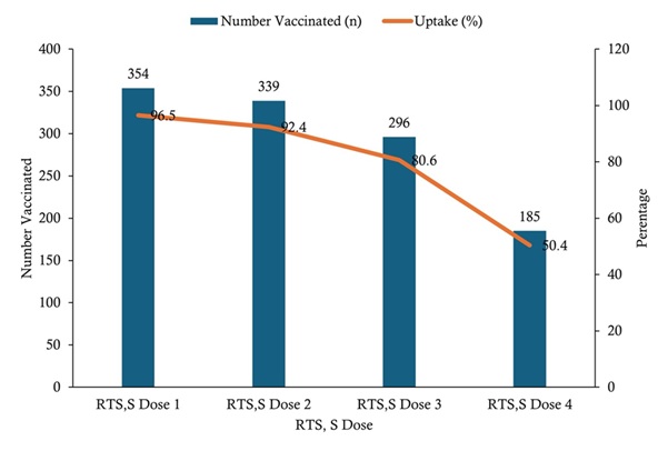 Uptake of RTS, S malaria vaccine doses among children aged 6–59 months was high for the initial doses but declined with subsequent doses. Coverage was highest for RTS, S dose 1 (354/367; 96.5%), followed by dose 2 (339/367; 92.4%) and dose 3 (296/367; 80.6%), while the lowest uptake was observed for dose 4 (185/367; 50.4%) (Figure 2).