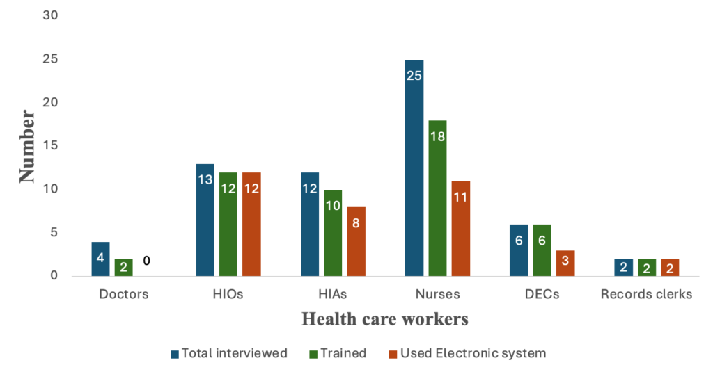 As shown in Figure 2, out of the 62 participants, 18 (72%) nurses were trained to use the electronic system, but 7 (28%) of them had not used the system. While both records clerks were trained and used the system, all six data entry clerks were trained, but only three of them used the system. On the other hand, 12 of the 13 HIOs were trained and used the system, and 10 of the 12 HIAs were trained, but only eight used the system. Two out of four doctors were trained, but none had used the electronic system, Figure 2.
