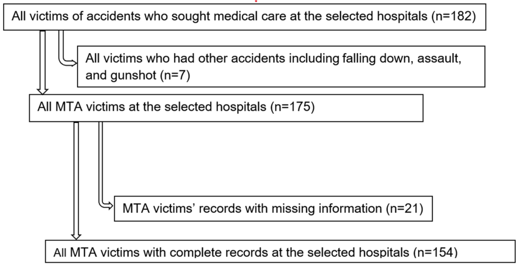 Figure 1 illustrates the distribution of MTA victims who sought medical care at selected hospitals within the study period. In total, 182 victims of accidents were involved in the study, with 175 of them having experienced MTAs, while the remaining 7 had other types of accidents, including falling down, assault, and gunshot. However, 21 MTA victims’ records were excluded due to missing information, leaving 154 MTA victims with complete record information for further analysis.