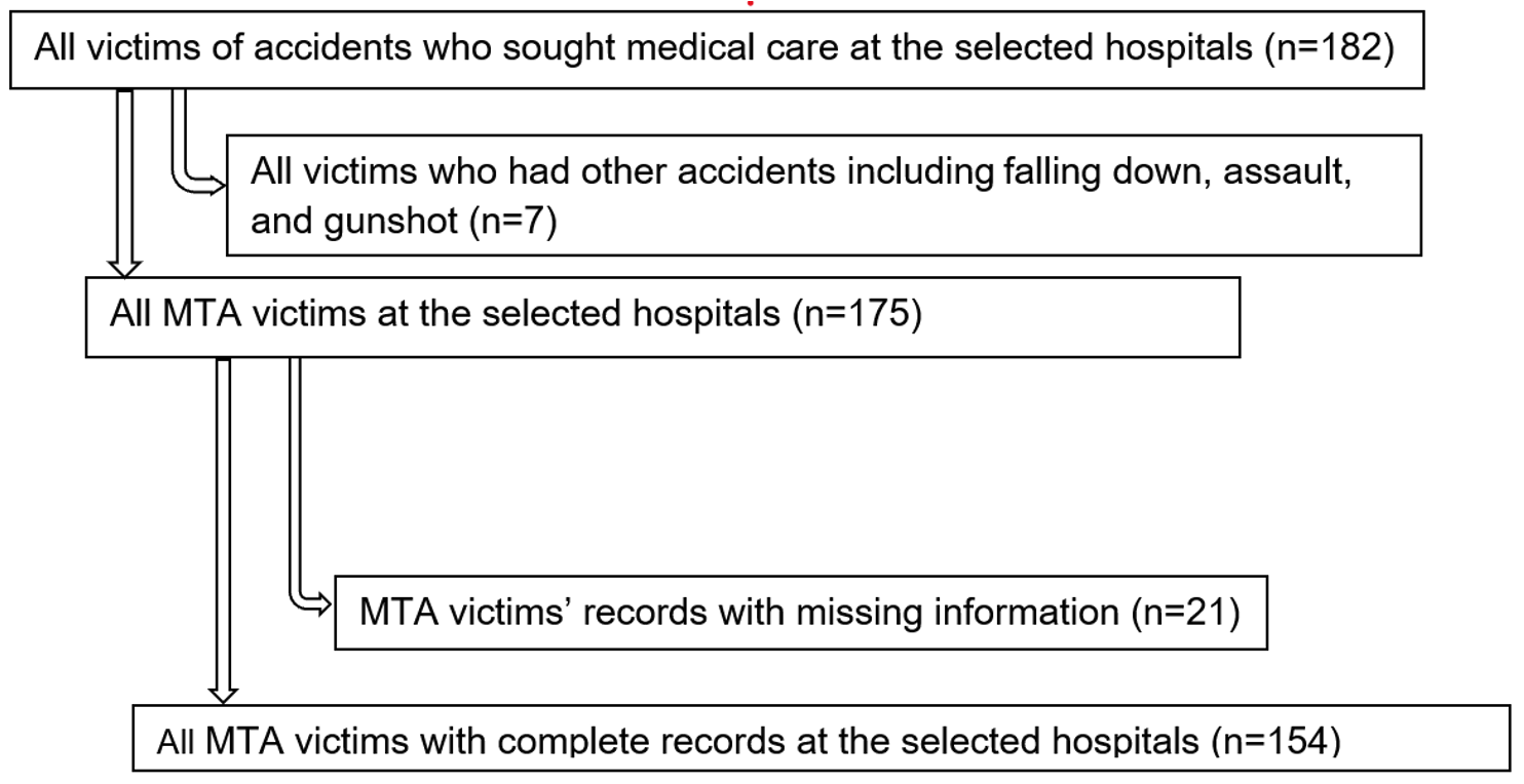 Exclusion criteria: Records of MTA victims with incomplete or missing information were excluded from the analysis.