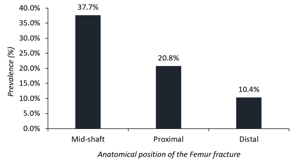 In this study, the prevalence of FSFs among MTA victims in Southern Tanzania was 37.7% (58/154) (Figure 2). The majority (29.3%, 17/58) of MTA victims with FSFs were from St. Walburg’s Nyangao Hospital, and the least (1.7%, 1/58) from Southern Zone Referral Hospital. The prevalence of other Femur fracture patterns was proximal femur 20.8 % (32/154), and the distal femur 10.4% (16/154) (Figure 2).